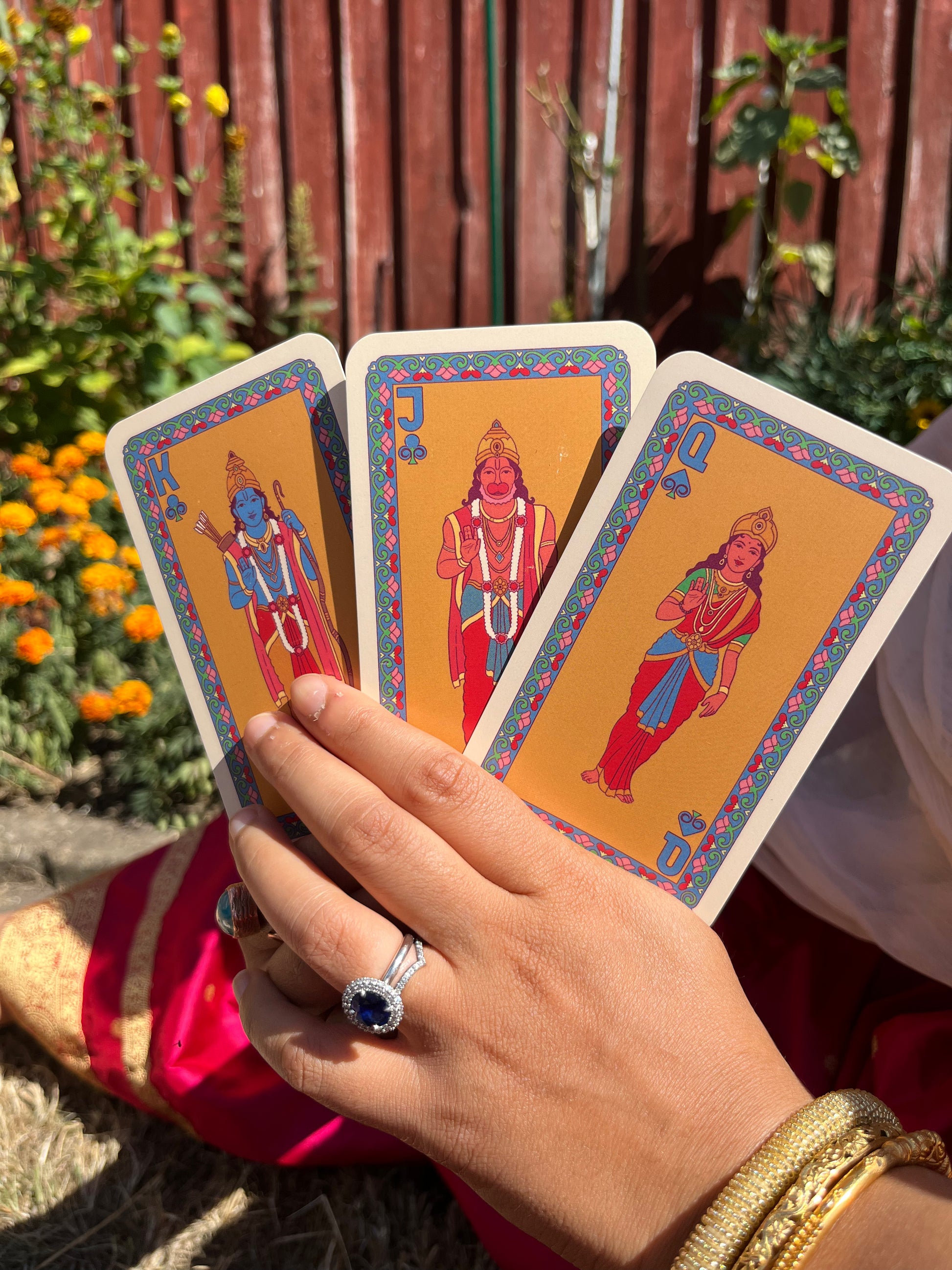 These are multifunctional beauties, with the reverse side of the card serving as a standard playing card, forming a 52 card deck inspired by traditional Indian cards. The King, Queen and Jack are Ram, Sita and Hanuman Ji (I know, we haven't dealt you a bad hand here...)